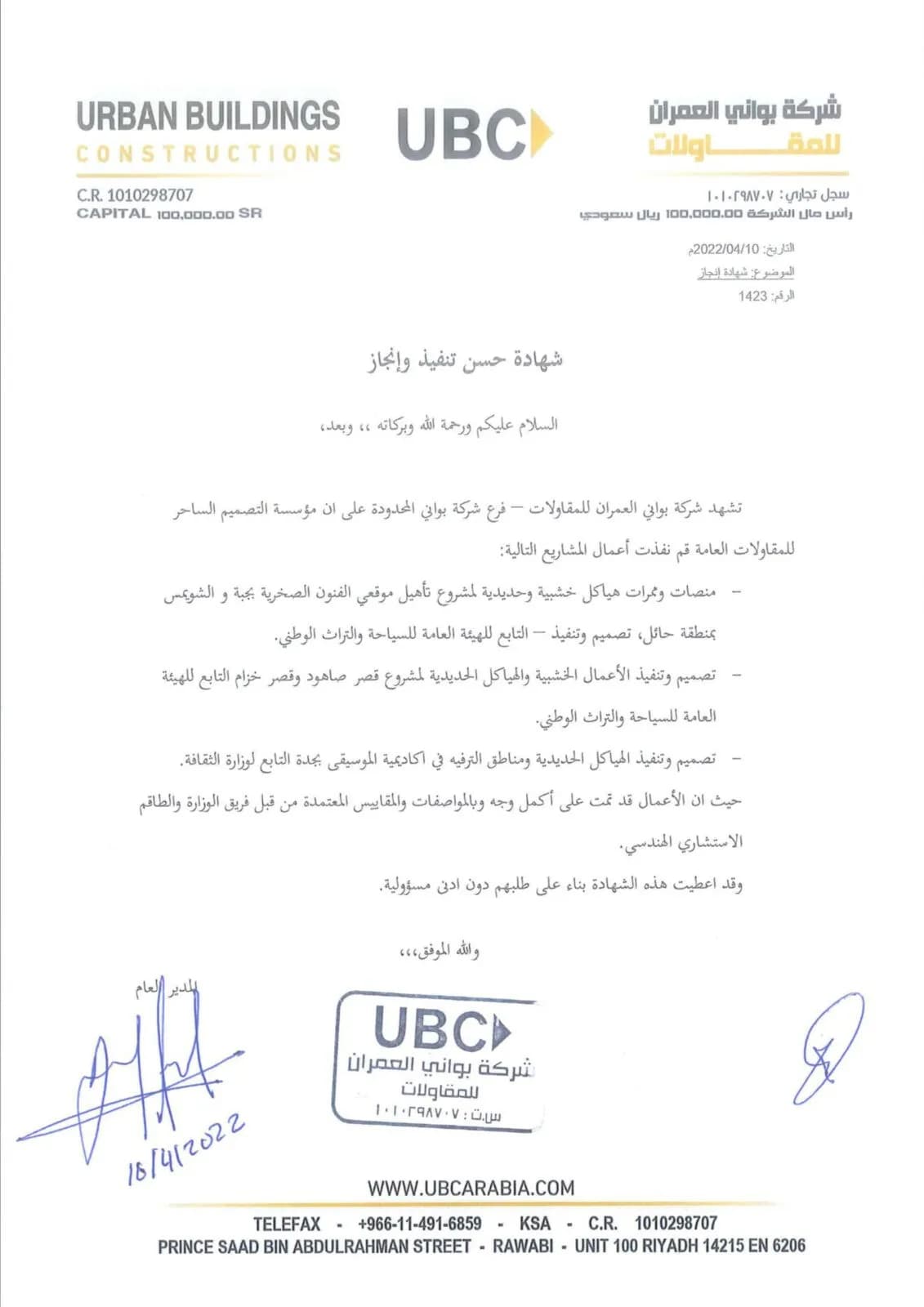 شهادة حسن أداء – شركة البواني للعمران